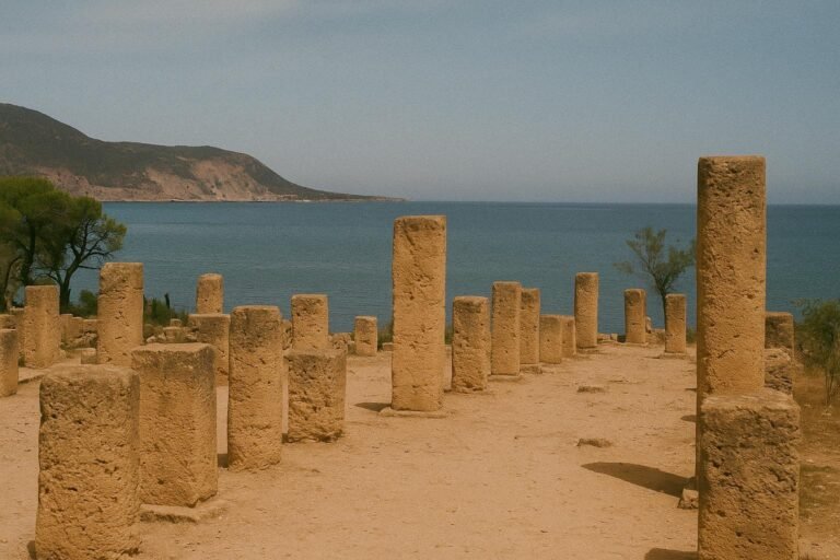 Nichée sur une presqu’île verdoyante caressée par les flots azurés de la Méditerranée, Tipasa se révèle comme un tableau vivant où l’histoire épouse le paysage. Ce site exceptionnel, classé au patrimoine mondial de l’UNESCO, dévoile un panorama unique où vestiges romains, mausolées paléochrétiens et horizon maritime se fondent en une harmonie saisissante.